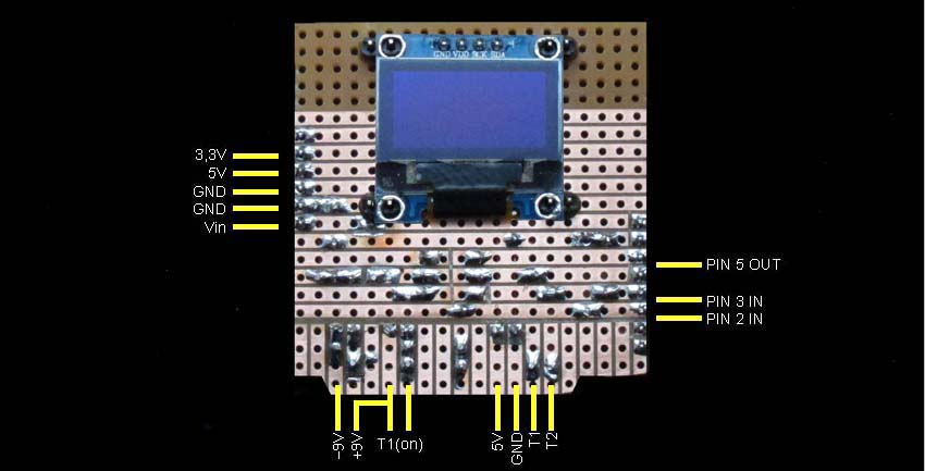 Die 2. Etage: Der Arduino bildet beim Zusammenbau die Basis aller Komponenten. Als erste Etage wird dann das USB-Host-Shield draufgesteckt. Ich habe es etwas modifiziert. D.h. die USB-Buchse entfernt und das Kabel fest angelötet. Für Buchse und Stecker ist in dem Gehäuse kein Platz. Die 2. Etage bildet eine neue Platine die, als Schield aufgesteckt alle zusätzlichen Komponenten aufnimmt. Also das Display mit den Widerständen, die Einschaltelektronik und die Anschlüsse für die Taster und der Batterie. Die Platine ist einfach aus einer Rasterplatine geschnitten. Der SD-Card-Reader hat unter dem USB-Host platzgefunden. Direkt aufgeklebt und verlötet. Die beiden Pull-Up-Widerstände sind auf dem Bild nicht zu sehen, da ich sie nachträglich eingebaut habe. |