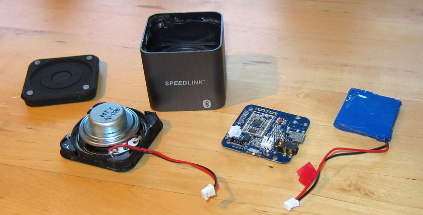 Bei meinen anfänglichen Elektronikplanungen hatte ich die Idee, extern etwas einmischen zu können, etwa von einem MP3-Player. Da mir der zusätzliche Aufwand zu groß erschien, überließ ich diese Entwicklung vorerst nachfolgenden Generationen. Jetzt läuft mir plötzlich ein kleines Gerät über den Weg was meinen Ehrgeiz wieder aufleben lässt. Eine kleine Bluetooth-Box. Drahtlos Metronomtakte, Drumloops oder Songs zum Begleiten zu übertragen erscheint mir sehr reizvoll. Nach dem Aufknacken der Box kommt tatsächlich eine winzige Platine zutage. Alles drauf: Spannungsstabilisierer, Bluetooth-Empfänger und Verstärker. Allerdings scheint es einfacher als es ist: Die getacktete Spannungsversorgungbringt extreme Spitzen in die Schaltung, die nur mit zusätzlicher Siebung in den Griff zu bekommen ist und ein leichtes Brummen übrig lässt. Schlimmer ist das Einkoppeln des Audiosignals. Einerseits weil es massefrei ist und sich so schlecht einkoppeln lässt, aber hauptsächlich weil der digitale Ausgang des chinesischen Chips IN4045 ein pulsbreitenmoduliertes Signal ausgibt und ich keine Ahnung habe, wie sich das mit dem analogen Signal mischen lässt. Tja, war halt ne Idee. Also doch für kommende Generationen. |